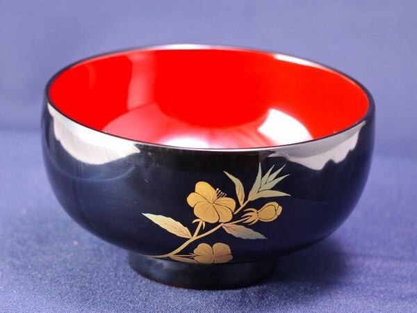 手にぴったり収まるサイズの汁椀。漆塗装なので、熱い汁物を入れても熱が伝わりにくい!お色は黒内朱と朱色の2色。こちらは表が黒色でお椀の中が朱色。お椀の底には六月二十一日の文字入りです。