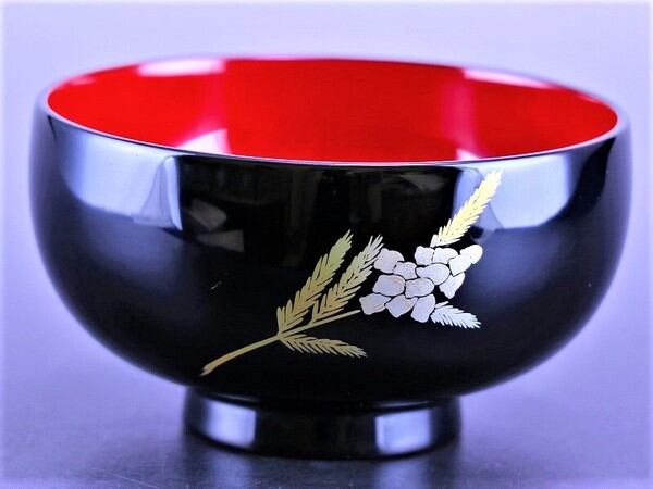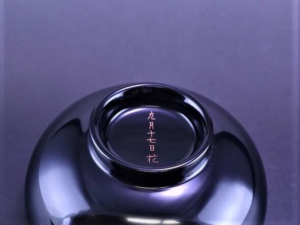 手にぴったり収まるサイズの汁椀。漆塗装なので、熱い汁物を入れても熱が伝わりにくい!お色は黒内朱と朱色の2色。こちらは表が黒色でお椀の中が朱色。お椀の底には九月十七日の文字入りです。