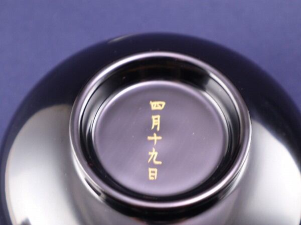 手にぴったり収まるサイズの汁椀。漆塗装なので、熱い汁物を入れても熱が伝わりにくい!お色は黒内朱と朱色の2色。こちらは表が黒色でお椀の中が朱色。お椀の底には四月十九日の文字入りです。