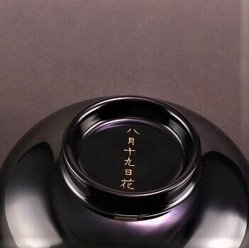 手にぴったり収まるサイズの汁椀。漆塗装なので、熱い汁物を入れても熱が伝わりにくい!お色は黒内朱と朱色の2色。こちらは表が黒色でお椀の中が朱色。お椀の底には八月十九日の文字入りです。