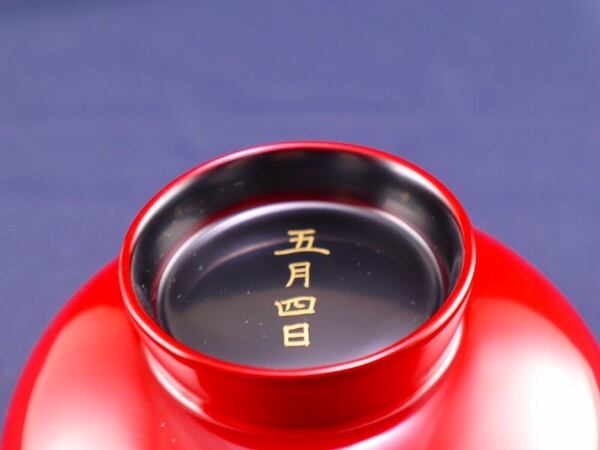 手にぴったり収まるサイズの汁椀。漆塗装なので、熱い汁物を入れても熱が伝わりにくい!お色は黒内朱と朱色の2色。こちらは全体が朱色で底が黒色。お椀の底には五月四日の文字入りです。