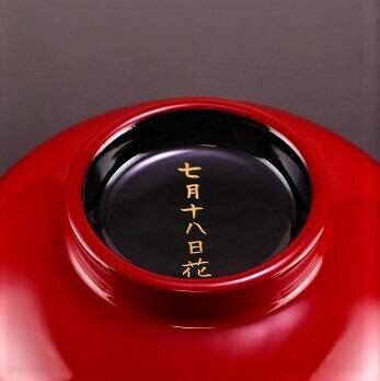 手にぴったり収まるサイズの汁椀。漆塗装なので、熱い汁物を入れても熱が伝わりにくい!お色は黒内朱と朱色の2色。こちらは全体が朱色で底が黒色。お椀の底には七月十八日の文字入りです。
