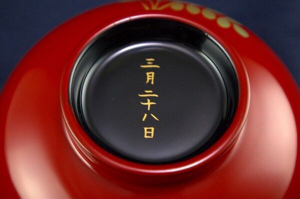手にぴったり収まるサイズの汁椀。漆塗装なので、熱い汁物を入れても熱が伝わりにくい!お色は黒内朱と朱色の2色。こちらは全体が朱色で底が黒色。お椀の底には三月二十八日の文字入りです。