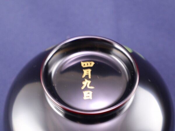 手にぴったり収まるサイズの汁椀。漆塗装なので、熱い汁物を入れても熱が伝わりにくい!お色は黒内朱と朱色の2色。こちらは表が黒色でお椀の中が朱色。お椀の底には四月九日の文字入りです。