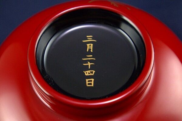 手にぴったり収まるサイズの汁椀。漆塗装なので、熱い汁物を入れても熱が伝わりにくい!お色は黒内朱と朱色の2色。こちらは全体が朱色で底が黒色。お椀の底には三月二十四日の文字入りです。