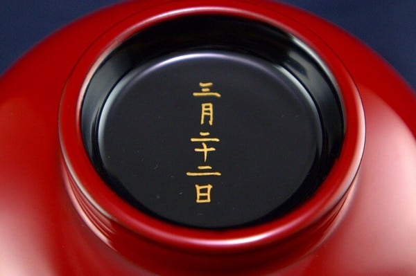 手にぴったり収まるサイズの汁椀。漆塗装なので、熱い汁物を入れても熱が伝わりにくい!お色は黒内朱と朱色の2色。こちらは全体が朱色で底が黒色。お椀の底には三月二十二日の文字入りです。