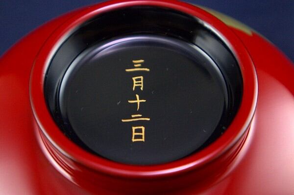 手にぴったり収まるサイズの汁椀。漆塗装なので、熱い汁物を入れても熱が伝わりにくい!お色は黒内朱と朱色の2色。こちらは全体が朱色で底が黒色。お椀の底には三月十二日の文字入りです。