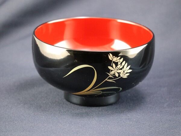 手にぴったり収まるサイズの汁椀。漆塗装なので、熱い汁物を入れても熱が伝わりにくい!お色は黒内朱と朱色の2色。こちらは表が黒色でお椀の中が朱色。お椀の底には二月二十七日の文字入りです。