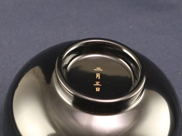 手にぴったり収まるサイズの汁椀。漆塗装なので、熱い汁物を入れても熱が伝わりにくい!お色は黒内朱と朱色の2色。こちらは表が黒色でお椀の中が朱色。お椀の底には二月三日の文字入りです。