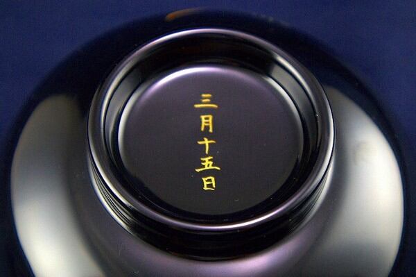 手にぴったり収まるサイズの汁椀。漆塗装なので、熱い汁物を入れても熱が伝わりにくい!お色は黒内朱と朱色の2色。こちらは表が黒色でお椀の中が朱色。お椀の底には三月十五日の文字入りです。