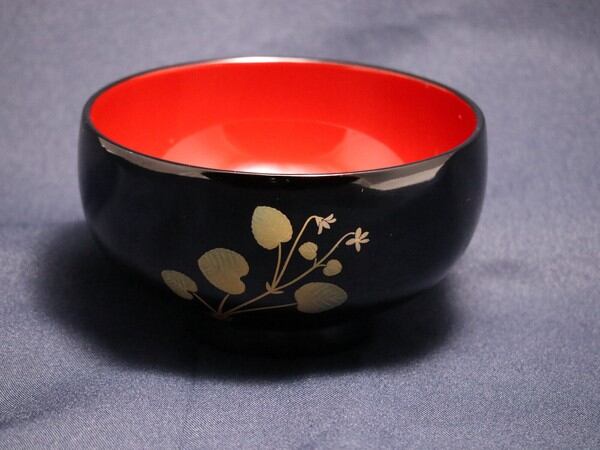 手にぴったり収まるサイズの汁椀。漆塗装なので、熱い汁物を入れても熱が伝わりにくい!お色は黒内朱と朱色の2色。こちらは表が黒色でお椀の中が朱色。お椀の底には一月九日の文字入りです。