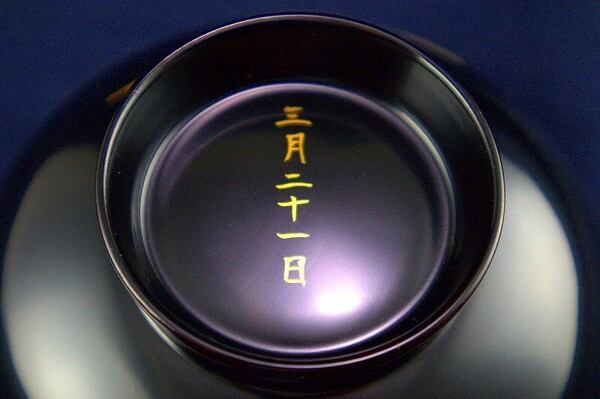 手にぴったり収まるサイズの汁椀。漆塗装なので、熱い汁物を入れても熱が伝わりにくい!お色は黒内朱と朱色の2色。こちらは表が黒色でお椀の中が朱色。お椀の底には三月二十一日の文字入りです。