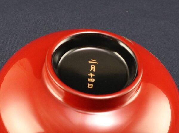 手にぴったり収まるサイズの汁椀。漆塗装なので、熱い汁物を入れても熱が伝わりにくい!お色は黒内朱と朱色の2色。こちらは全体が朱色で底が黒色。お椀の底には二月十四日の文字入りです。