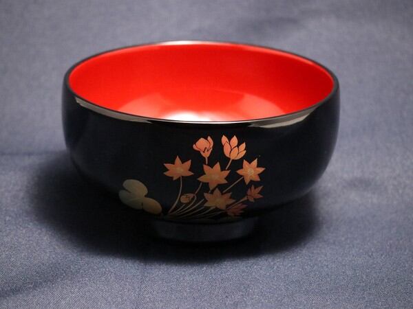 手にぴったり収まるサイズの汁椀。漆塗装なので、熱い汁物を入れても熱が伝わりにくい!お色は黒内朱と朱色の2色。こちらは表が黒色でお椀の中が朱色。お椀の底には一月五日の文字入りです。