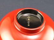 手にぴったり収まるサイズの汁椀。漆塗装なので、熱い汁物を入れても熱が伝わりにくい!お色は黒内朱と朱色の2色。こちらは全体が朱色で底が黒色。お椀の底には二月二十日の文字入りです。
