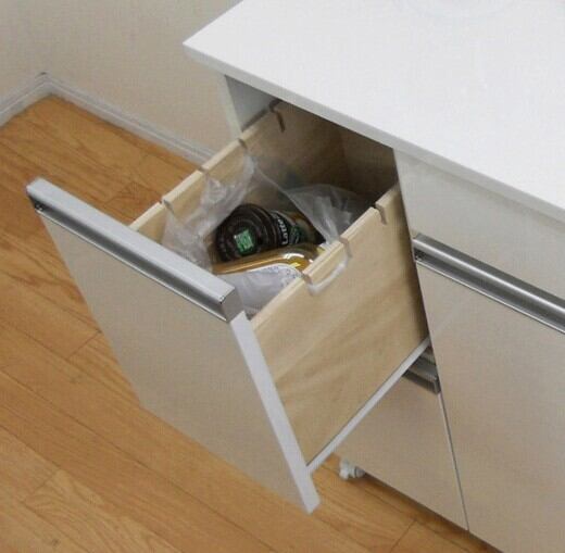 ●左側の引出は側板に切り込みを入れ、レジ袋などを引っ掛けて使えるように工夫あり