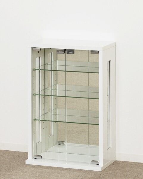 ●背面はカガミ張りで奥行が感じられ、前面・側面・棚板がガラスですので、開放的で圧迫感を抑えます