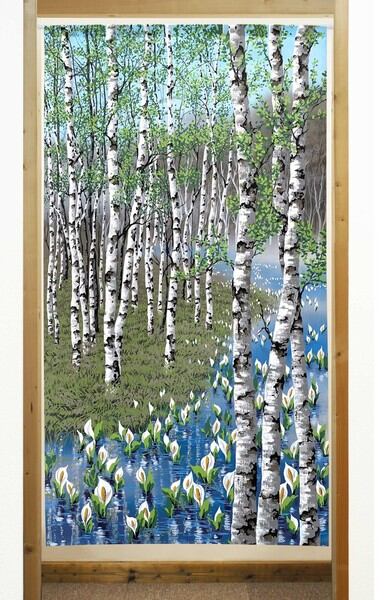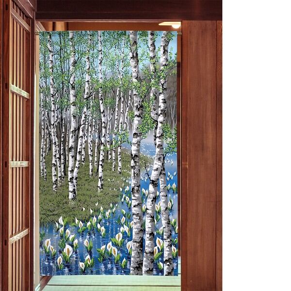 のれん 受注生産 目隠し 「白樺と水芭蕉」85x150cm 日本製 風景 景色 / 家具・インテリア ファブリック・敷物