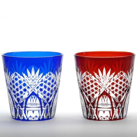 カットすることにより表面の色ガラスから内側の透明なグラスが見えてきて、透明と色ガラスの素晴しいコントラストが、伝統の文様や花切子のデザインで浮き上がります