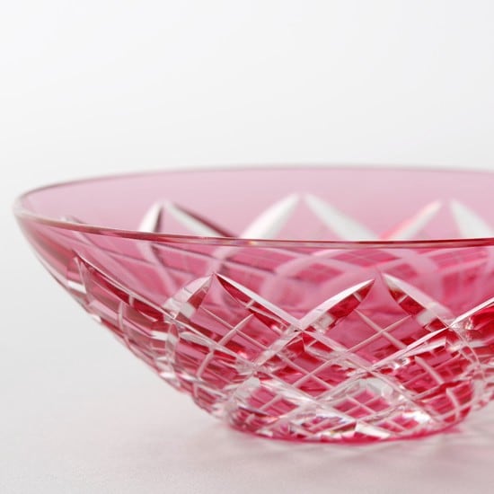 カットすることにより表面の色ガラスから内側の透明なグラスが見えてきて、透明と色ガラスの素晴しいコントラストが、伝統の文様や花切子のデザインで浮き上がります