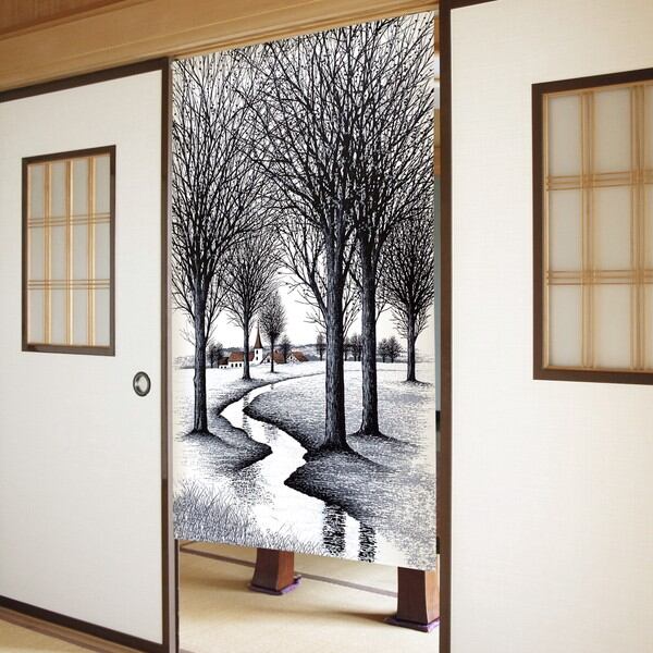 のれん 受注生産 目隠し 「村外れの小川」85x150cm 日本製 風景 景色 / 家具・インテリア ファブリック・敷物