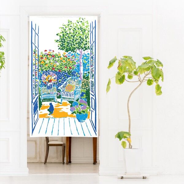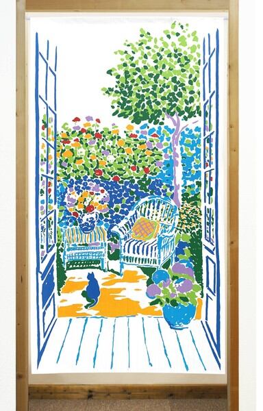 のれん 受注生産 目隠し 「ネコとガーデンテラス」85x150cm 日本製 風景 景色 / 家具・インテリア ファブリック・敷物