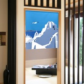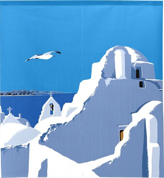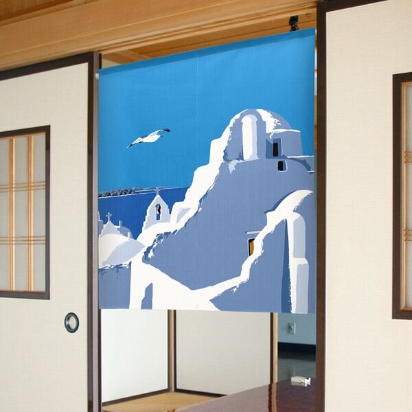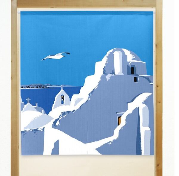 のれん 受注生産 目隠し 「白い街並みと海」85x90cm 日本製 風景 景色 / 家具・インテリア ファブリック・敷物