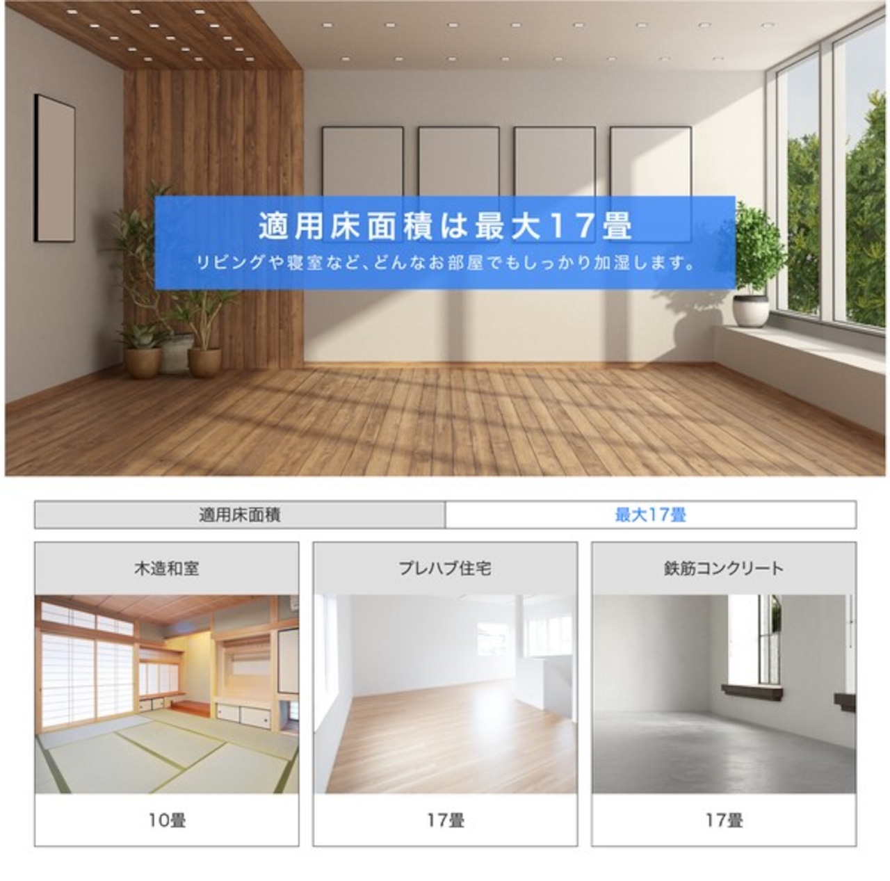 適用床面積:「木造」約10畳/「プレハブ」約17畳