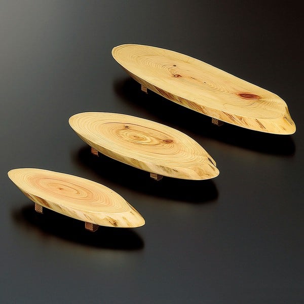 ひのきの丸太(主に間伐材)を斜めに輪切りにした料理皿です