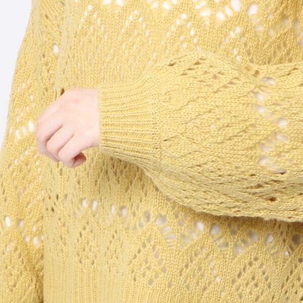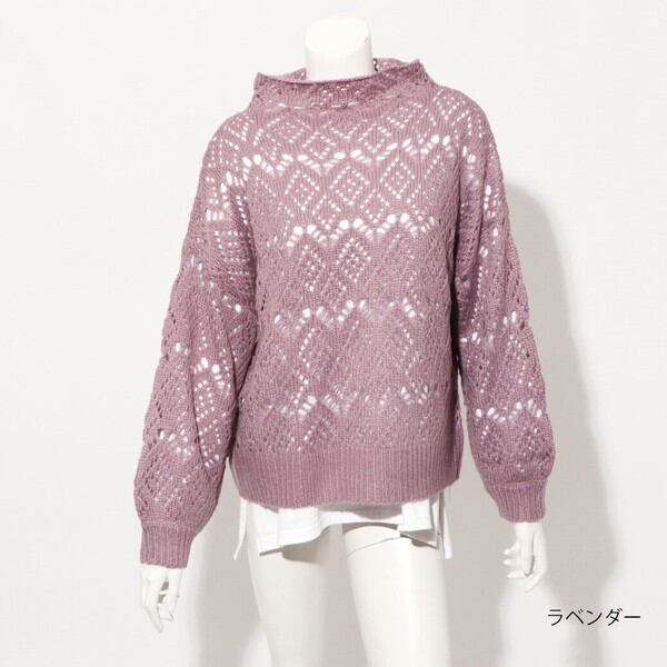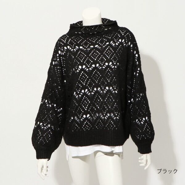 ゆったりハイネックでゆとりをもって被れる透かし編みニットプルオーバーが登場★