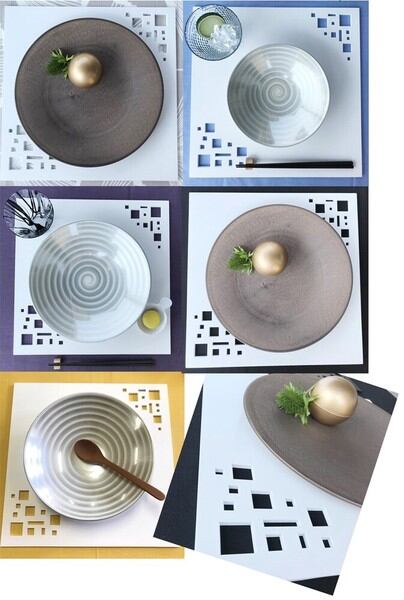 正方形の木製マットレーザー加工で四角い模様を抜くことで、下に敷かれたクロスやテーブルの色が見えるようになっています。クロスを変えることで表に見える柄の色が変わって楽しむことも出来ます。