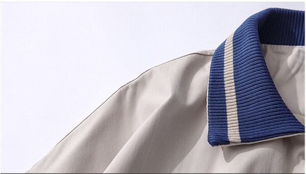 襟や袖口のリブのラインと前立て中央の同色ドットボタンが味わいのあるレトロなアクセントを強調