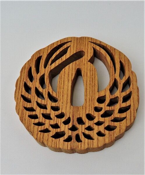 刀の鍔をイメージし、加工した木製鍋敷きです