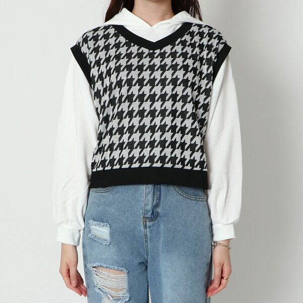 お洒落重ね着が一枚で完了の柄ドッキングベストが登場★