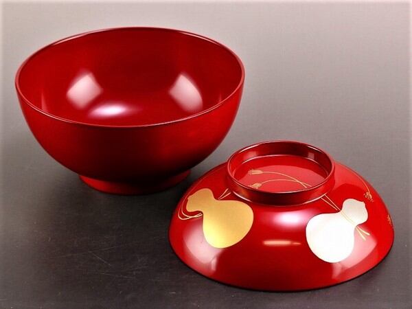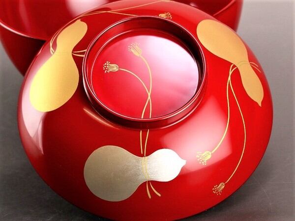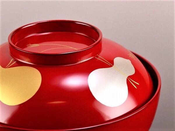 お雑煮だけでなく煮物をいれたりと使い方は自由です。金銀の華やかな瓢箪の蒔絵はひとつひとつ蒔絵師によって描かれた物。瓢箪は縁起がよいもこともあり、末永くご使用頂けます。