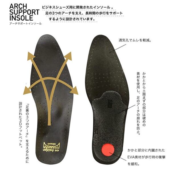 【アーチサポートインソール「enbridge」で正しい姿勢と快適な履き心地を】・ビジネスカジュアルシューズ用に開発されたアーチサポートインソール搭載・踵から土踏まずまで硬質のアーチ素材を使用し、三点アーチをより的確にサポートします
