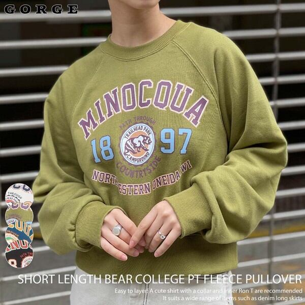 短丈クマカレッジプリント裏毛プルオーバー / ファッション レディースアパレル トップス スウェット・パーカー