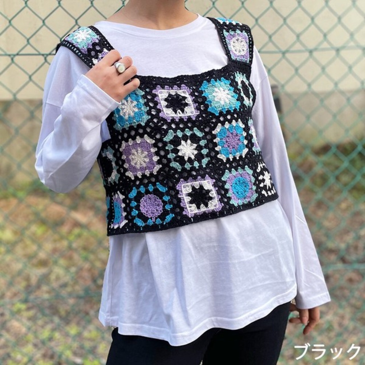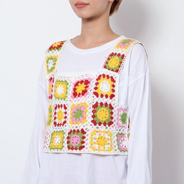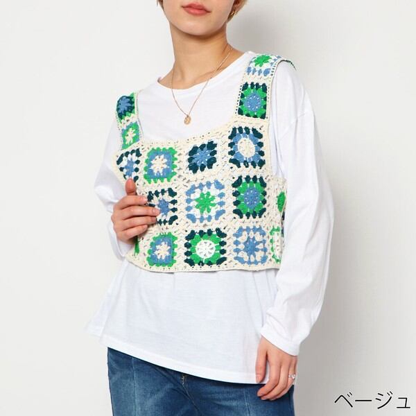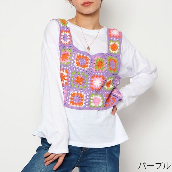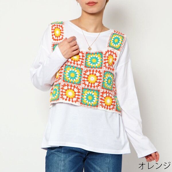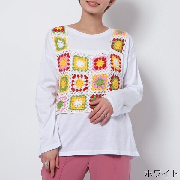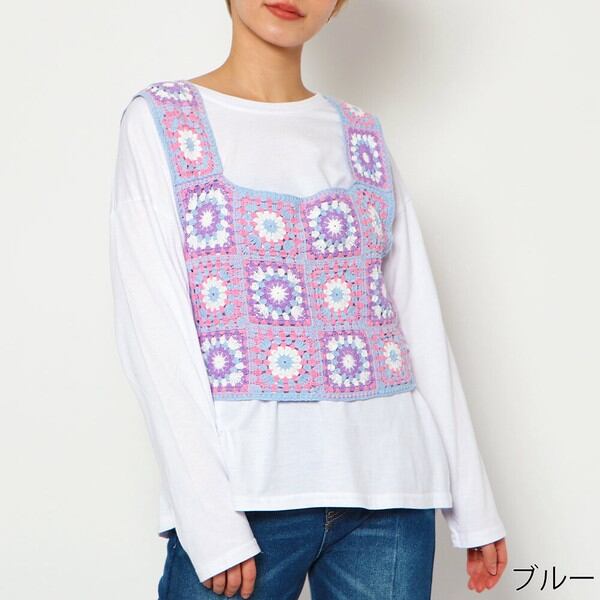 ユニークでキュートなタンクトップトップスが目を惹くロンT付きかぎ針トップスが登場★