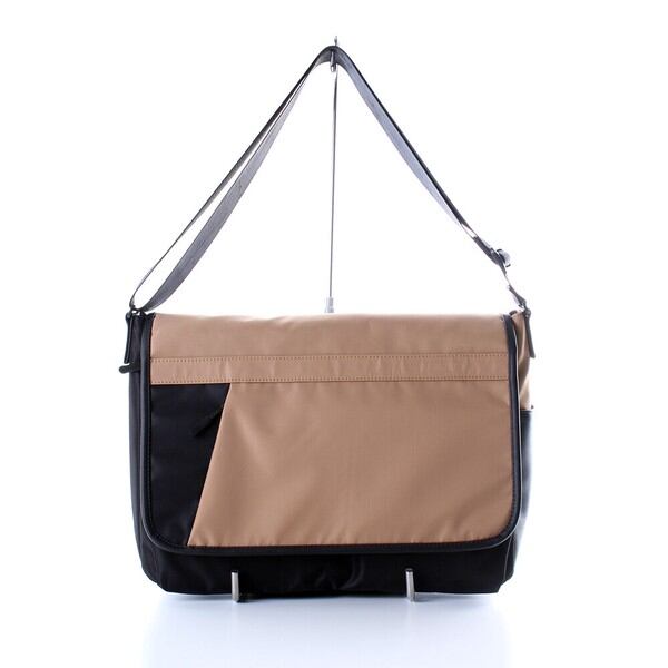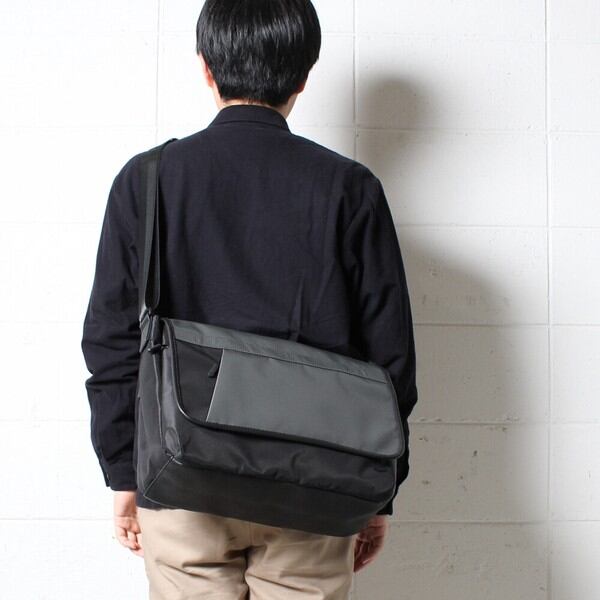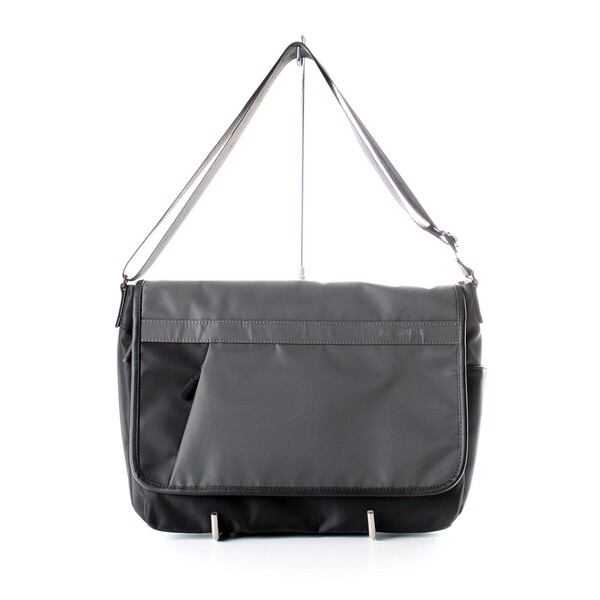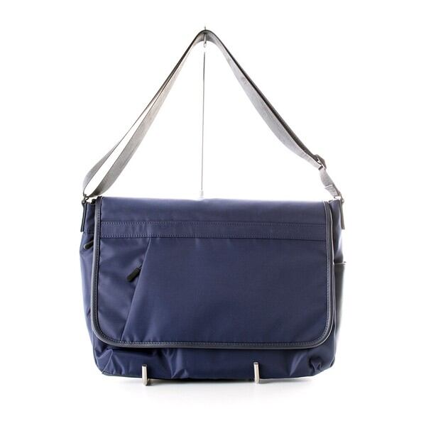 撥水軽量のポリエステル素材と高級感のあるPUレザーを組み合わせてしっかりとした存在感を引き出したデザインかぶせショルダーです