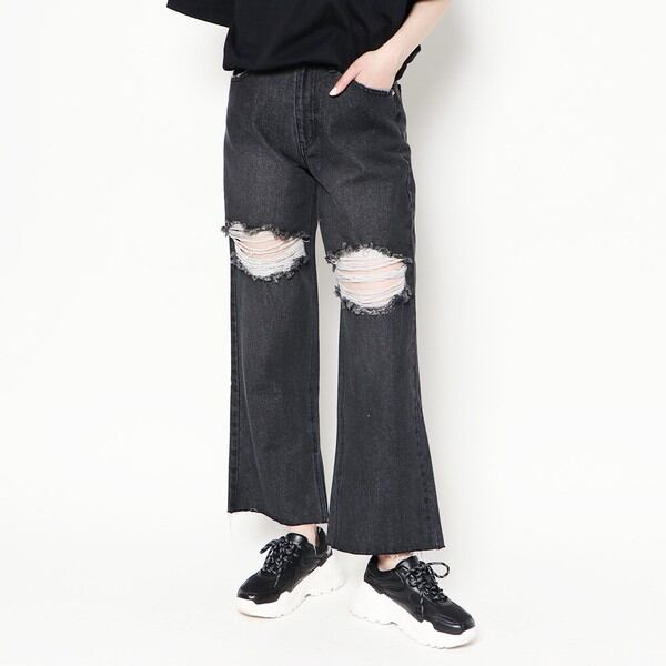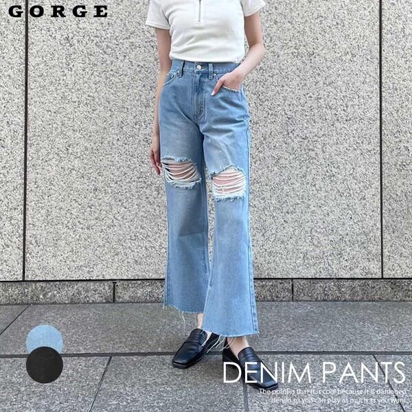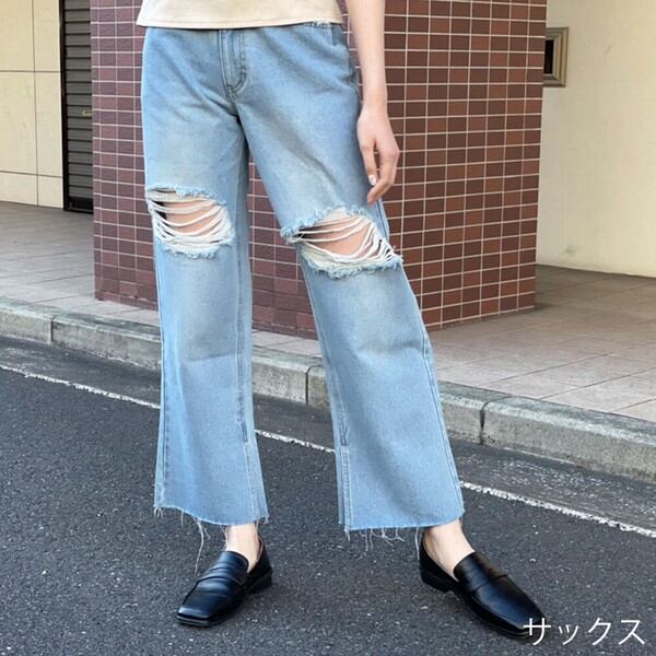 内スリットダメージデニムパンツ / ファッション レディースアパレル ボトムス フルレングスパンツ