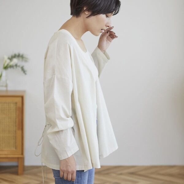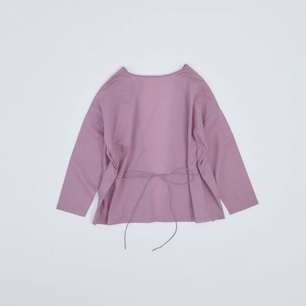 カシュクールデザインのトップスは、サイドのホールに内側からストリングを通し後ろで結んでもらうと、羽織としても着用しやすいようになっています