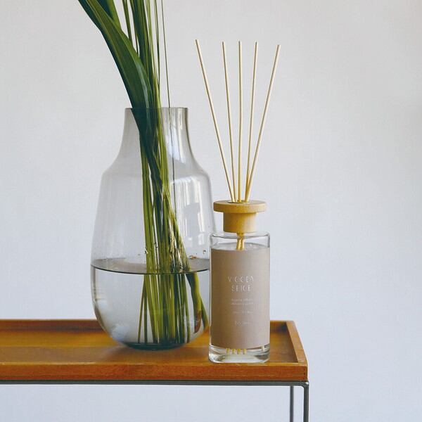 ガラス瓶にナチュラルなWOOD素材の蓋が付いたリードディフューザーです