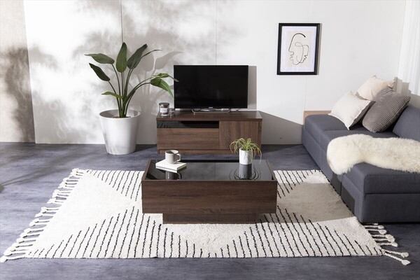 シンプルですっきりした見た目と、豊富な収納力を兼ね揃えた『Connie(コニー)』のガラス天板センターテーブル