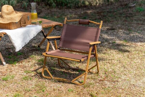 木目調のアルミフレームと天然木のアームレストがナチュラルな雰囲気を演出する、折りたたみアウトドアチェア