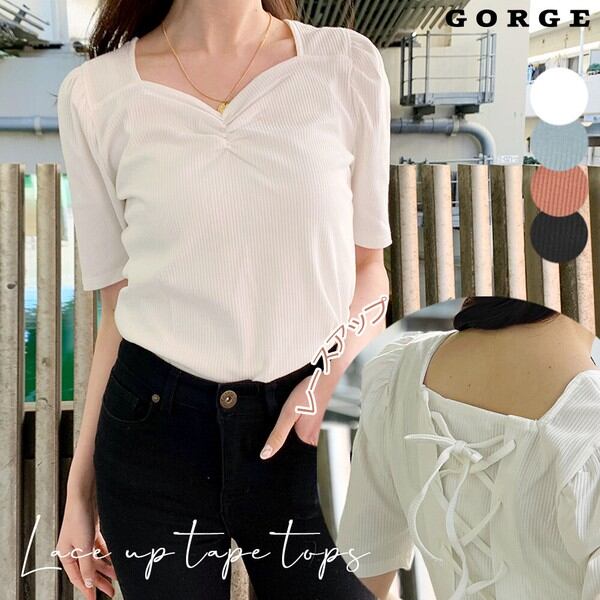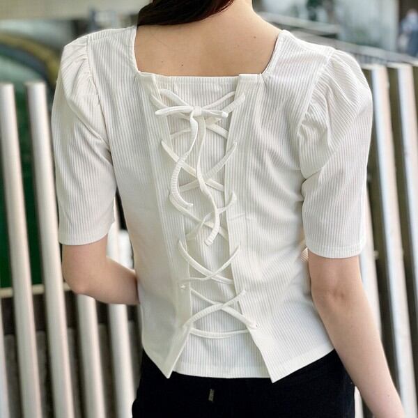 肩ギャザーが大人っぽくデコルテラインが美しく見せられるレースアップテレコトップスが登場★