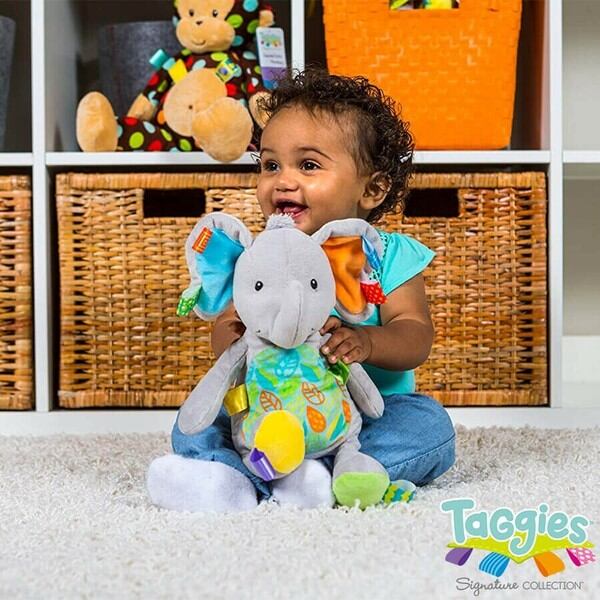 たくさんのタグが付いた「タギーズシリーズ」より登場したゾウのぬいぐるみです