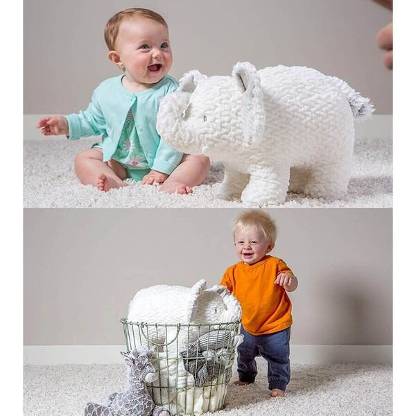 ニュートラルなグレーとホワイトの色合いが特徴的なゾウのぬいぐるみです