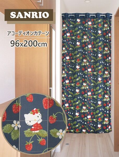 受注生産アコーディオンカーテン サンリオ「ハローキティ 刺繍風イチゴ」96x200cm 日本製 パタパタ / 家具・インテリア ファブリック・敷物 のれん