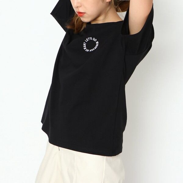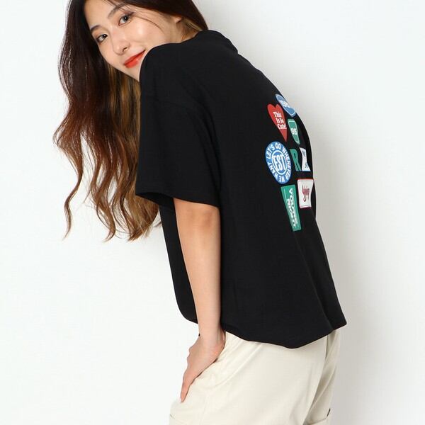 ステッカーが貼りつけられたようなプリントデザインが今っぽいバックカラフルプリントTシャツが登場★サークル型の英字刺しゅうが大人っぽくてカッコイイ♪ボトムインで背中のプリント見せがスッキリクールな印象に◎