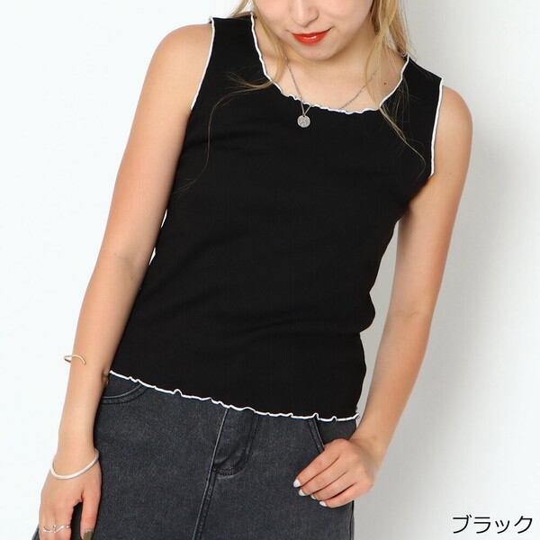 アウトラインに配色メロウ加工がされた可愛らしいリブメロウタンクトップが登場★タンクトップなので暖かいシーズンは一枚、晩夏からインナーにも使えちゃう♪ゆらゆらとした波感のあるデザインが女性らしいデザインで女子力アップ◎